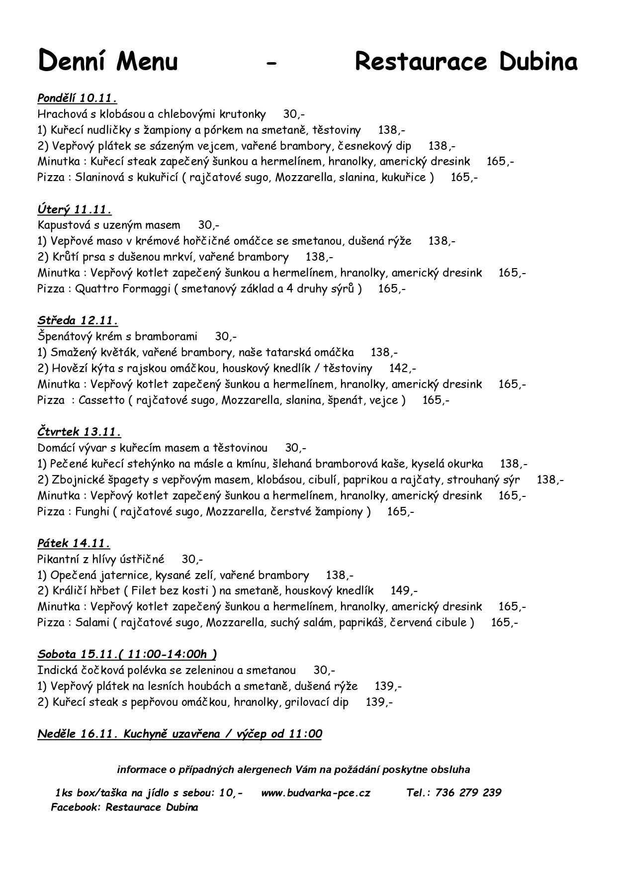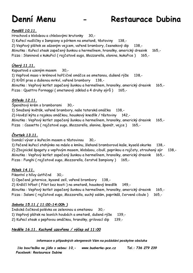 3.11. – 6.11. Kuchyně do 14:00h, 7.11. Pátek 10:30 – 20h, Sobota 8.11. 11:00 – 14:00h, Neděle 9.11. Kuchyně uzavřena.